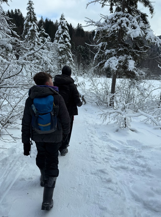 Bei einer winterlichen Wanderung zum Frillensee lag viel Schnee, wodurch der Weg stellenweise sehr rutschig war. Dies erforderte gegenseitige Rücksichtnahme und sorgte gleichzeitig für viele lustige Momente. Während der Wanderung nutzten die Schülerinnen und Schüler die Zeit für Gespräche, Austausch der Ferienereignisse und gemeinsames Erleben.