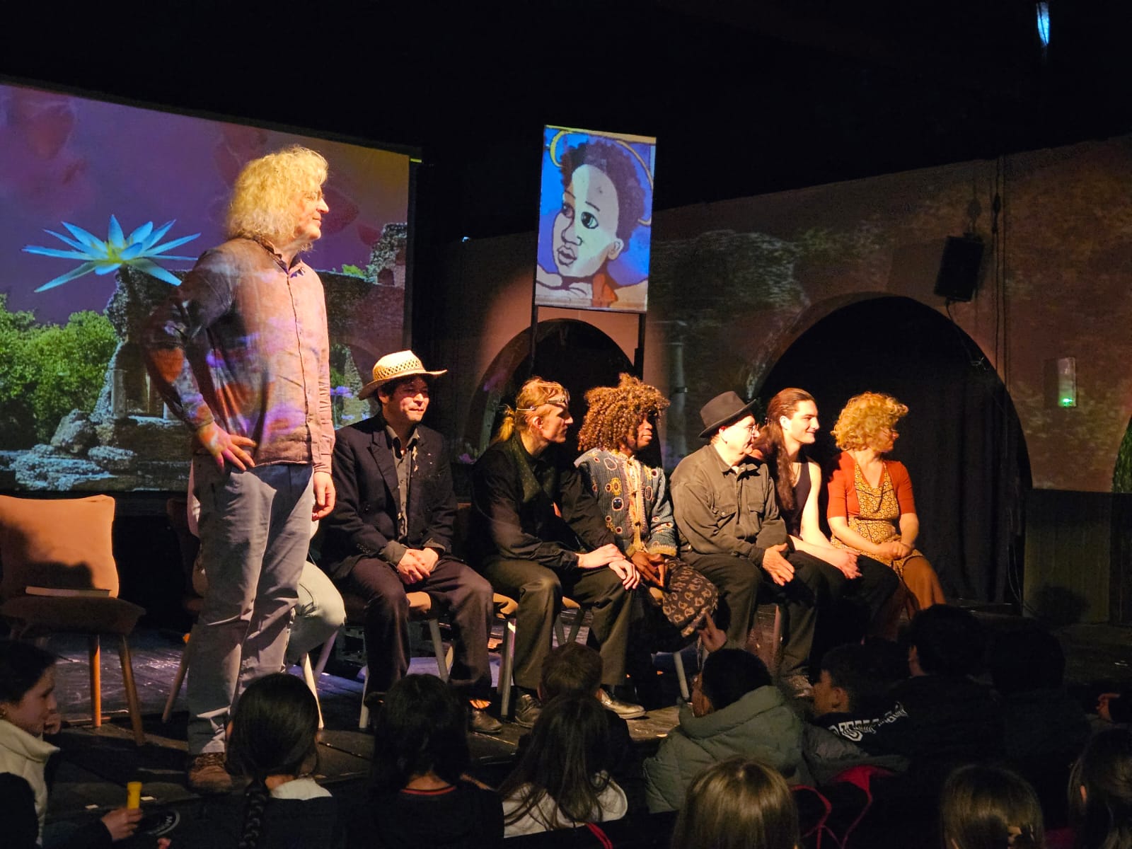 Im Anschluss an die Aufführung durften die Schülerinnen und Schüler in einem Nachgespräch Fragen an die Schauspielerinnen und Schauspieler stellen. Dabei wurde zum Beispiel gefragt, wie die Projektionsleinwand im Theater funktionierte, wie es gelingt, auf der Bühne so überzeugend zu zittern und Gefühle auszudrücken, und natürlich gab es auch einige persönliche Fragen an die Crew von „Momo“.